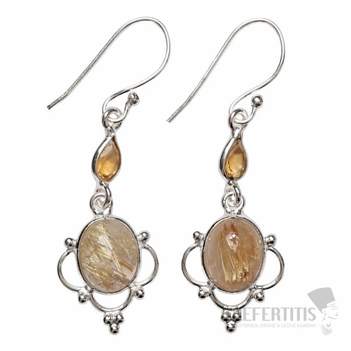 Atraktivní stříbrné designové náušnice se sagenity a broušenými citríny. Sagenit doslova září zlatavými inkluzemi "zlatého" rutilu jako sluníčko na letní obloze. Velmi optimistický a dobrou náladu již od pohledu dávající šperk. Ag 925. Uvedená váha je celého páru. Kupujete přímo vyobrazený pár.