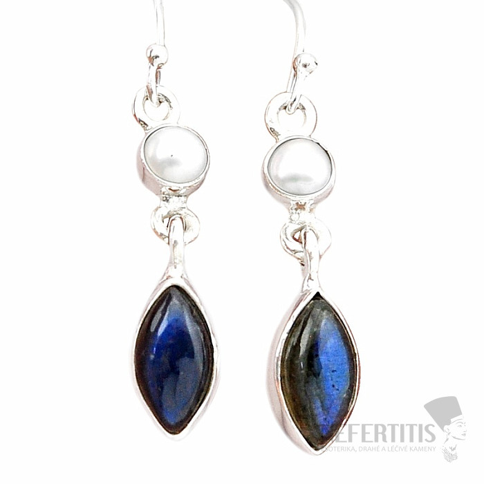 Krásné stříbrné náušnice s labradority s výraznou hrou barev, ve které se při dopadu světla kouzelně rozzáří jasná modrá barva, a perlami. Ag 925. Uvedená váha je celého páru. Kupujete přímo vyobrazený šperk.
