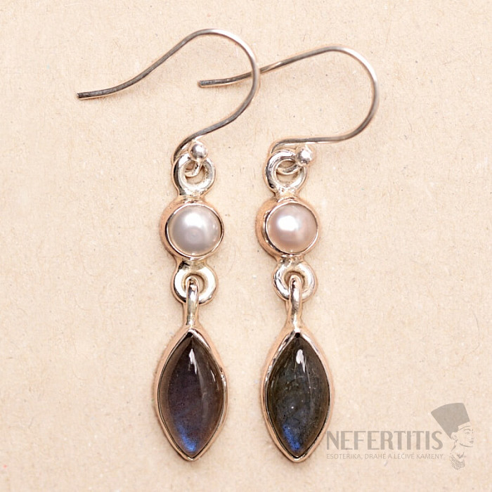 Krásné stříbrné náušnice s labradority s výraznou hrou barev, ve které se při dopadu světla kouzelně rozzáří jasná modrá barva, a perlami. Ag 925. Uvedená váha je celého páru. Kupujete přímo vyobrazený šperk.