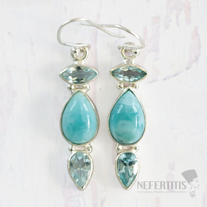 Elegantní stříbrné náušnice s kabošony larimaru, jenž připomíná hru slunečních paprsků na hladině moře, a broušenými tanzanity. Ag 925. Uvedená váha je celého páru. Kupujete přímo vyobrazený šperk. Larimar, také zvaný… více »