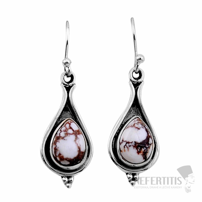 Stříbrné náušnice s magnezitem Wild horse, nacházejícícím se v Arizoně. Ag 925. Tento druh magnezitu má neopakovatelnou, nezaměnitelnou kresbu - krásné mramorování v bílém magnezitu. Uvedená váha je celého páru. Kupujete přímo vyobrazený šperk.