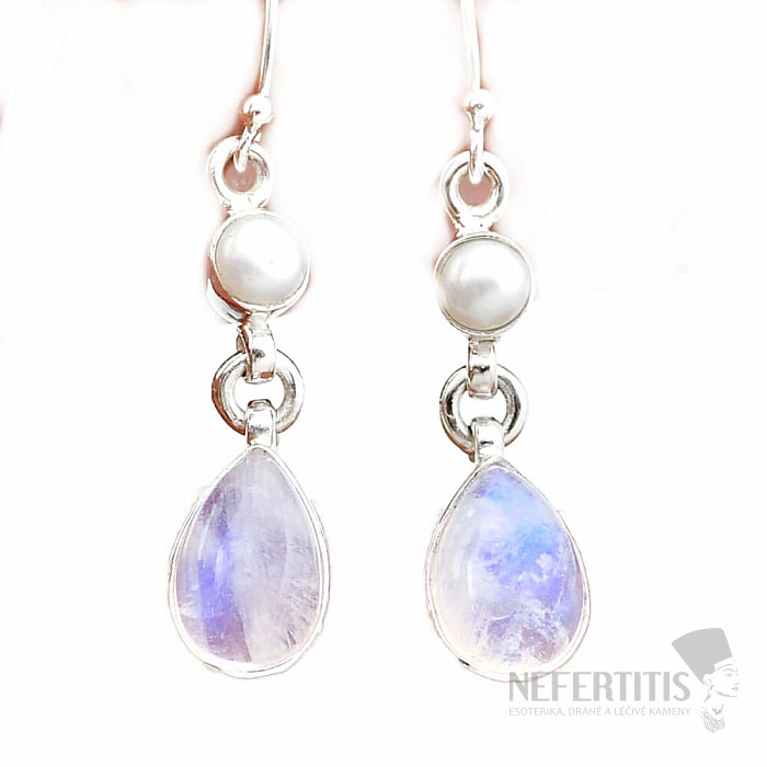 Stříbrné náušnice s duhovým měsíčním kamenem a perlou. Ag 925. Náušnice jsou nepřehlédnutelné nejen kvůli atraktivnímu tvaru, ale zejména kvůli jejich výjimečně krásné a výrazné "hře duhy". Uvedená váha je celého páru. Kupujete přímo vyobrazený pár.