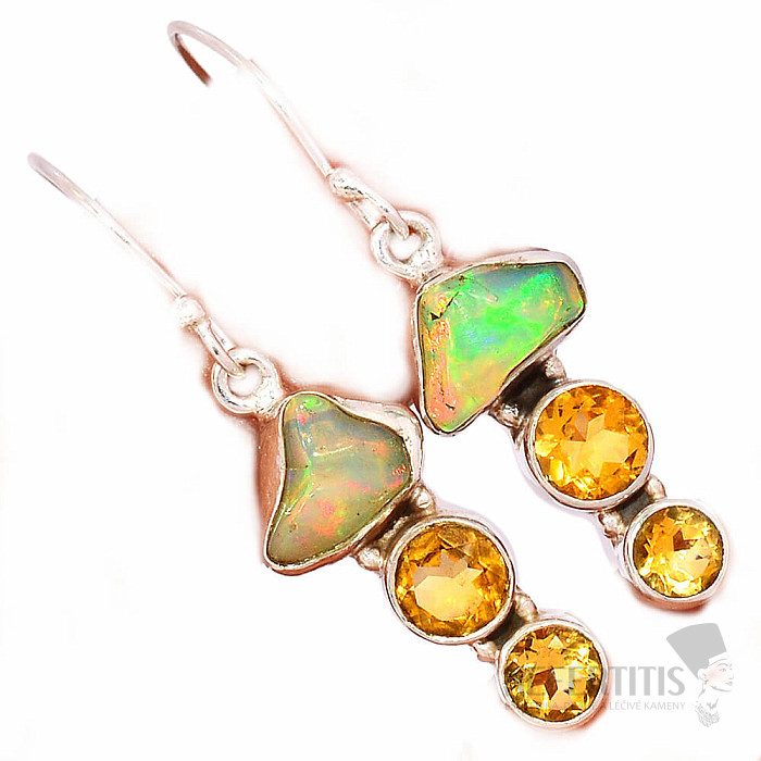 Okouzlující stříbrné náušnice se surovými, zaleštěnými opály, s krásnou hrou barev, a broušenými citríny. Ag 925. Působivý a elegantní šperk, od pohledu navozující radost a pocity harmonie. Etiopské opály oproti australským opálům doslova hýří až neonově zářivými odlesky barev. Ačkoliv na první pohled na to nevypadají, ohňostroj barev, který z opálu v těchto náušnicích vytryskne při každém dopadu světla, okouzlí nejen vás, ale celé vaše okolí. Uvedená váha je celého páru. Kupujete přímo vyobrazený šperk.