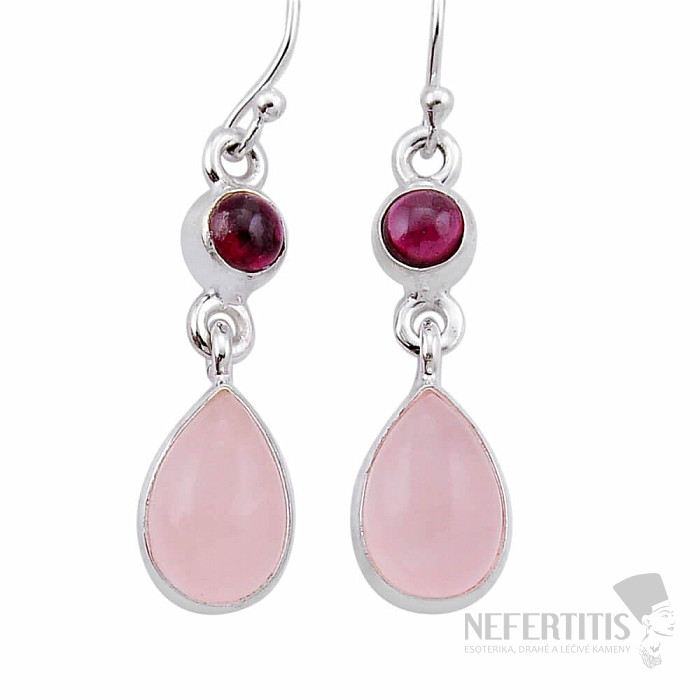 Stříbrné náušnice s kabošony růženínu a granátu. Ag 925. Krásné kabošony růženínu vás okouzlí svou něžnou barvou. Růženín je symbolem lásky, krásy a uzdravování. Uvedená váha je celého páru. Kupujete přímo vyobrazený šperk.