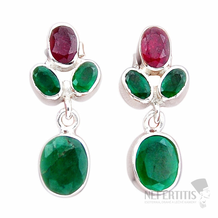 Elegantní a výrazné stříbrné náušnice s broušenými indickými smaragdy a broušeným indickým rubínem. Ag 925. Náušnice mají zapínání na puzetu. Smaragd indický je obchodní označení přírodního kamene, nejčastěji sillimanitu či korundu, uměle dobarvovaného do barvy smaragdu. Nejde tedy o přírodní smaragd. Uvedená váha je celého páru. Kupujete přímo vyobrazený pár.