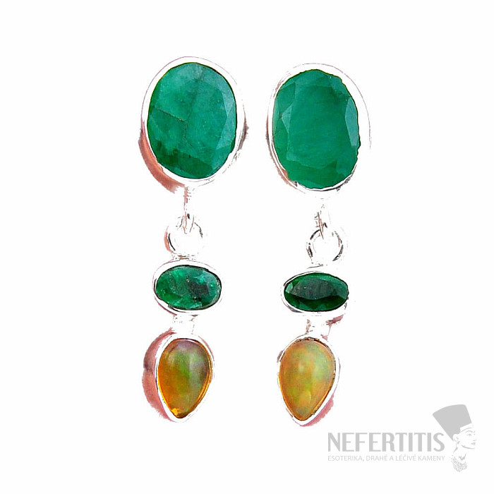 Elegantní a výrazné stříbrné náušnice s broušenými indickými smaragdy a kabošonem etiopského opálu. Ag 925. Náušnice mají zapínání na puzetu. Smaragd indický je obchodní označení přírodního kamene, nejčastěji sillimanitu či korundu, uměle dobarvovaného do barvy smaragdu. Nejde tedy o přírodní smaragd. Kupujete přímo vyobrazený pár. Uvedená váha je celého páru.