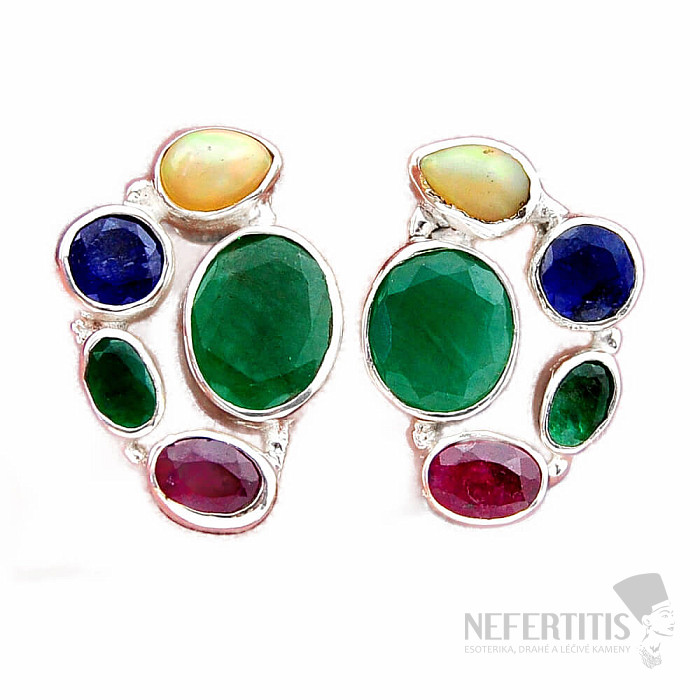 Elegantní a výrazné stříbrné náušnice s broušenými indickými smaragdy, broušeným indickým safírem, broušeným indickým rubínem a kabošonem etiopského opálu. Ag 925. Náušnice mají zapínání na puzetu. Smaragd indický je obchodní označení přírodního kamene, nejčastěji sillimanitu či korundu, uměle dobarvovaného do barvy smaragdu. Nejde tedy o přírodní smaragd. Kupujete přímo vyobrazený pár. Uvedená váha je celého páru.