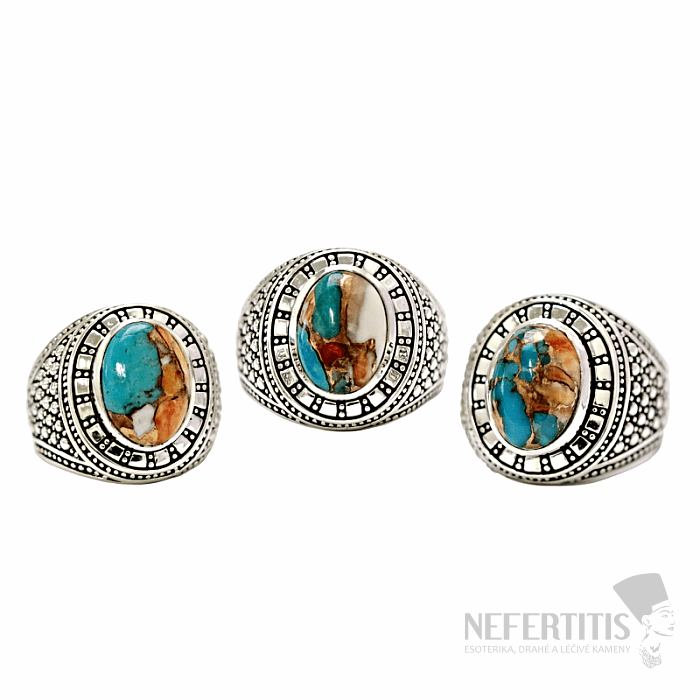 Výsledkem je fascinující kompozitní kámen s výraznou barevnou hrou: od oranžových, červených a fialových tónů mušloviny, přes modré odstíny tyrkysu až po měděné linky. Spiny Oyster tyrkys představuje spojení moře, země a kovu – tedy harmonie přírodních živlů.