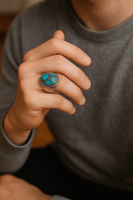 Tento stříbrný prsten s tyrkysem je perfektní volbou pro muže, kteří chtějí šperk, jenž je na první pohled nepřehlédnutelný. Díky většímu kameni (16 mm) a originálnímu zdobení se hodí jak k volnočasovému, tak i elegantnímu outfitu.