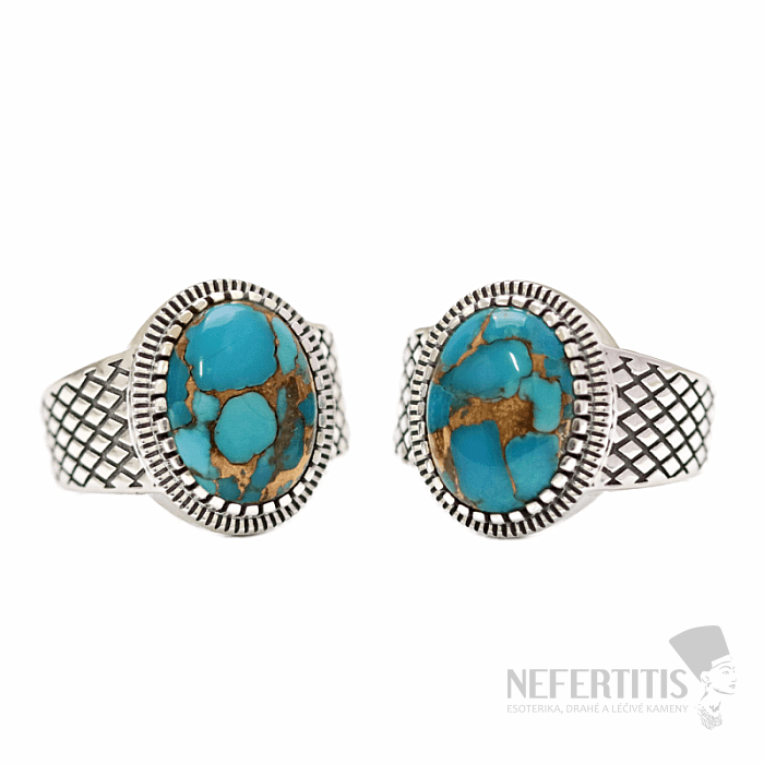 Kámen je tvořen kousky přírodního tyrkysu spojenými mědí, díky čemuž má jedinečnou mozaikovou kresbu s kontrastem tyrkysově modrých a hnědavých žilek. Obroučka prstenu je zdobena rytým vzorem připomínajícím šachovnici, který dodává šperku moderní i tradiční charakter zároveň.