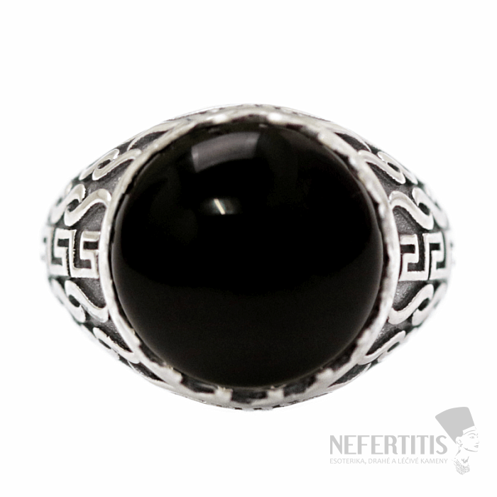 Tento elegantní pánský stříbrný prsten je osazen velkým přírodním onyxem o průměru 15 mm, který svým hlubokým černým leskem působí sebevědomě a výrazně. Prsten o hmotnosti cca 8,5 g je vyroben z kvalitního stříbra a zdoben precizně vyrytými ornamenty. Boční strany prstenu nesou tradiční geometrické a plamenné vzory, které podtrhují mužný a odvážný charakter šperku. Ilustrativní vyobrazení.