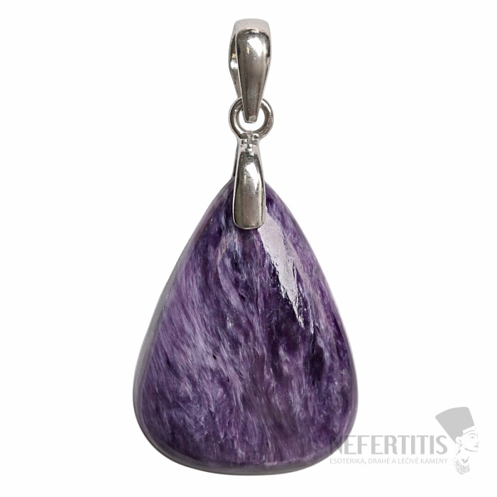 Stříbrný přívěsek s čaroitem je výrazný šperk z minerálu, který zaujme svou jedinečnou fialovou barvou a charakteristickou vláknitou kresbou. Čaroit je vzácný minerál známý svými odstíny fialové, levandulové a purpurové barvy, které se často prolínají v zajímavých přírodních vzorech. Každý kámen je originální a vytváří neopakovatelný vzhled.