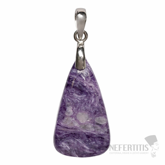 Stříbrný přívěsek s čaroitem je výrazný šperk z minerálu, který zaujme svou jedinečnou fialovou barvou a charakteristickou vláknitou kresbou. Čaroit je vzácný minerál známý svými odstíny fialové, levandulové a purpurové barvy, které se často prolínají v zajímavých přírodních vzorech. Každý kámen je originální a vytváří neopakovatelný vzhled.