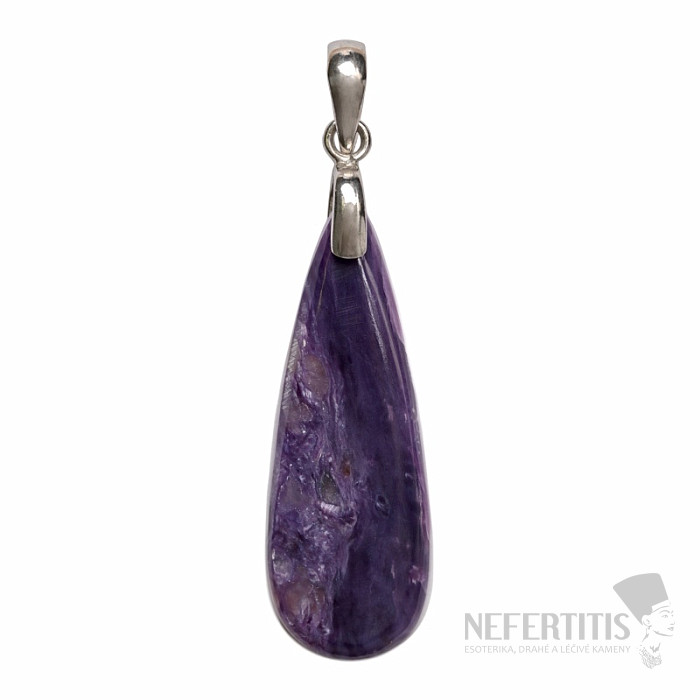 Stříbrný přívěsek s čaroitem je výrazný šperk z minerálu, který zaujme svou jedinečnou fialovou barvou a charakteristickou vláknitou kresbou. Čaroit je vzácný minerál známý svými odstíny fialové, levandulové a purpurové barvy, které se často prolínají v zajímavých přírodních vzorech. Každý kámen je originální a vytváří neopakovatelný vzhled.