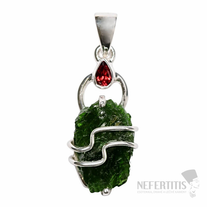 Krásný designový stříbrný přívěsek se surovým chromdiopsidem a broušeným granátem. Ag 925. Kupujete přímo vyobrazený šperk.