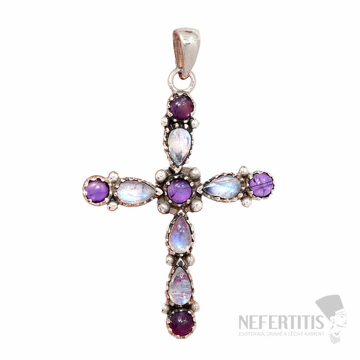 Krásný designový stříbrý přívěsek s duhovým měsíčním kamenem a ametystem. Ag 925. Výrazný šperk, který každého okouzlí a nikdo jej na vás nepřehlédne. Kupujete přímo vyobrazený šperk.