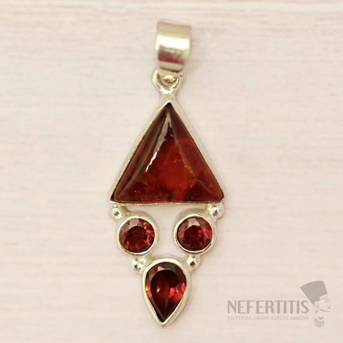 Stříbrný přívěsek s krásným medově zbarveným baltským jantarem a broušenými granáty. Ag 925. Výrazný a vskutku nepřehlédnutelný přívěsek. Kupujete přímo vyobrazený šperk.