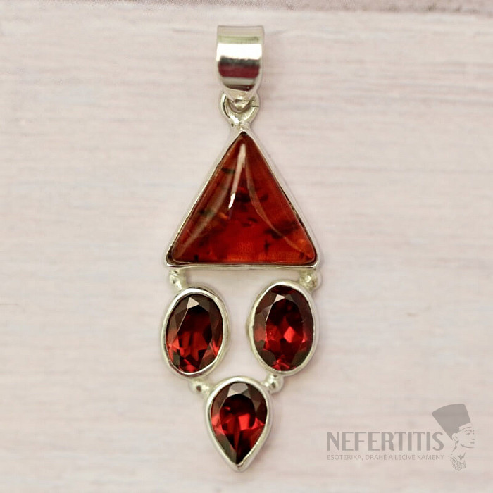 Stříbrný přívěsek s krásným medově zbarveným baltským jantarem a broušenými granáty. Ag 925. Výrazný a vskutku nepřehlédnutelný přívěsek. Kupujete přímo vyobrazený šperk.