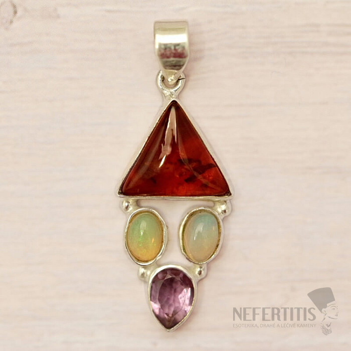 Stříbrný přívěsek s krásným medově zbarveným baltským jantarem, etiopskými opály a broušeným ametystem. Ag 925. Výrazný a vskutku nepřehlédnutelný přívěsek. Kupujete přímo vyobrazený šperk.