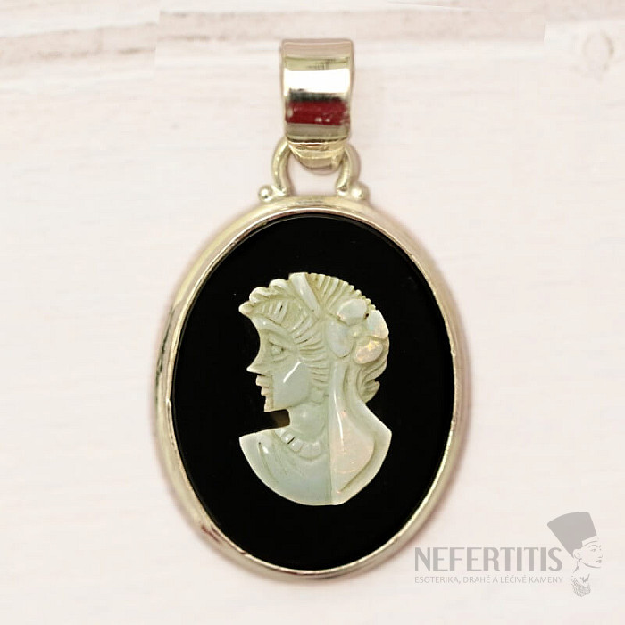 Stříbrný přívěsek z onyxu - Kamej s reliéfem v antickém stylu. Ag 925. Atraktivní a výrazná barevná kombinace, která činí šperk nevšedním doplňkem pro různé příležitosti. Kupujete přímo vyobrazený šperk.