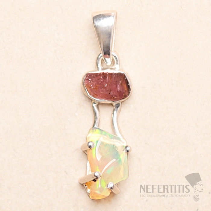 Elegantní stříbrný přívěsek ze surového, zaleštěného opálu, s krásnou hrou barev, a surového růžového turmalínu. Ag 925. Působivý a elegantní šperk, od pohledu navozující radost a pocity harmonie. Etiopské opály oproti australským opálům doslova hýří až neonově zářivými odlesky barev. Ačkoliv na první pohled na to nevypadají, ohňostroj barev, který z opálu v tomto přívěsku vytryskne při každém dopadu světla, okouzlí nejen vás, ale celé vaše okolí. Kupujete přímo vyobrazený šperk.