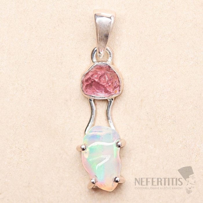 Elegantní stříbrný přívěsek ze surového, zaleštěného opálu, s krásnou hrou barev, a surového růžového turmalínu. Ag 925. Působivý a elegantní šperk, od pohledu navozující radost a pocity harmonie. Etiopské opály oproti australským opálům doslova hýří až neonově zářivými odlesky barev. Ačkoliv na první pohled na to nevypadají, ohňostroj barev, který z opálu v tomto přívěsku vytryskne při každém dopadu světla, okouzlí nejen vás, ale celé vaše okolí. Kupujete přímo vyobrazený šperk.