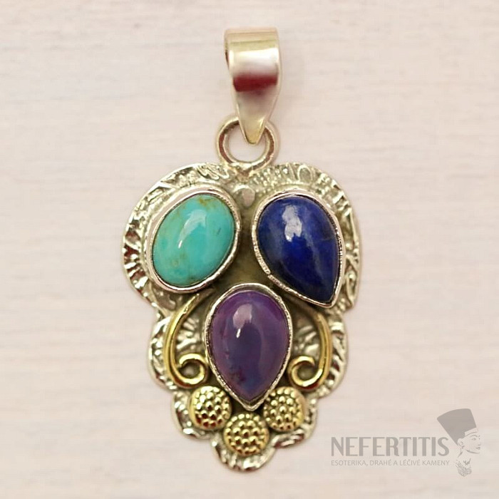 Výjimečný stříbrný, částečně pozlacený, přívěsek s kousky přírodního, barveného tyrkysu, spojovaných mědí do působivych kabošonů krásné purpurovo - fialové a modré barvy, a s Lapisem Lazuli. Tento typ šperků získává ve světě na velké oblibě z důvodu stále rostoucí ceny jednolitých kusů přírodního tyrkysu. Takto vytvářené kabošony jsou jednou z mála možností, jak si dnes pořídit šperk s přírodním tyrkysem za relativně dostupnou cenu. Ag 925. Kupujete přímo vyobrazený šperk.