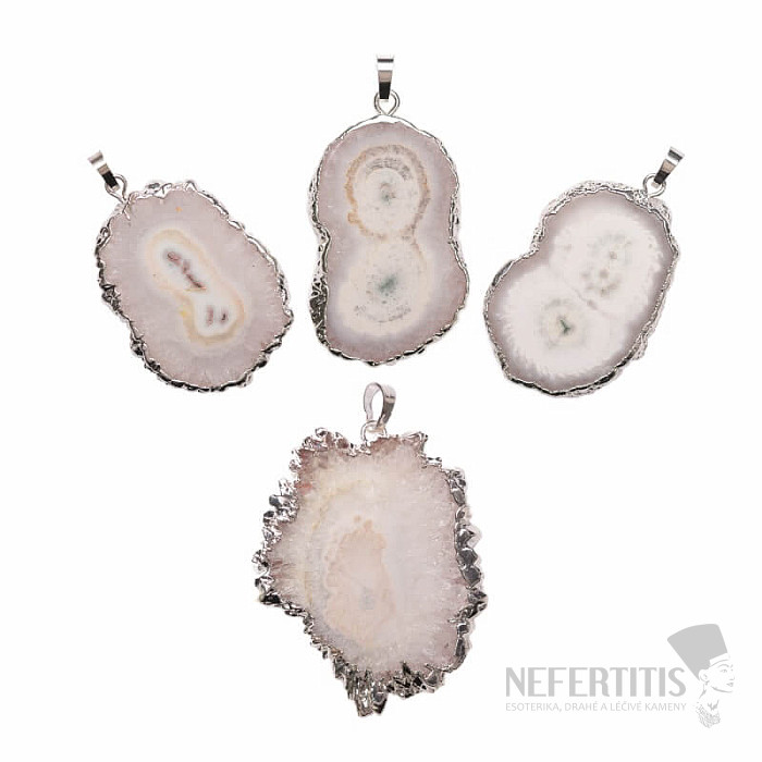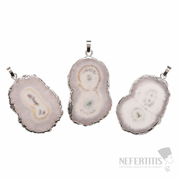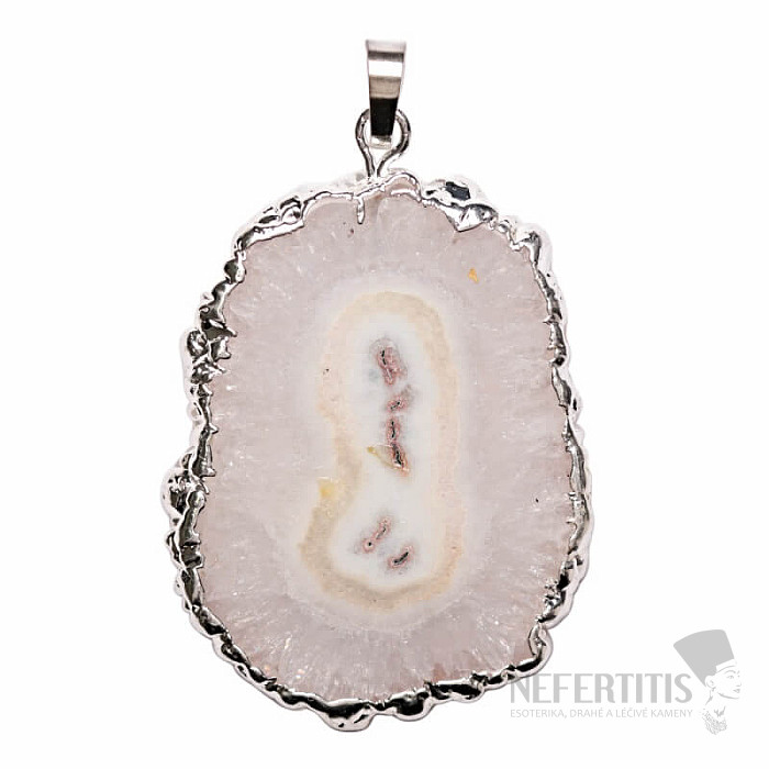 Atraktivní přívěsek ze vzácného tzv. solárního křišťálu z křemenného stalaktitu - krápníku vznikajícího hluboko v jeskyni po miliony let, jehož vzniku dá počátek první kapka minerální vody. Následně při určitém minerálním složení vody vzniká achátový střed, ze které se vytváří buď ještě vzácnější ametystový krápník či o něco málo méně vzácný, přesto unikátní krápník křemene až křišťálu s poetickým jménem solární křišťál. Řezy solárním křišťálem jsou velmi oblíbené pro výrobu šperků díky jeho struktuře, kdy křišťál kolem achátové středu vytváří útvary podobné sluneční koroně. Solární křišťál v přírodním stavu nemá atraktivní barvu, proto je pro šperkařské účely dobarvován. Velikost přívěsku: cca 4,5 až 5 cm bez závěsného očka. Materiál: přírodní minerál, obecný kov.