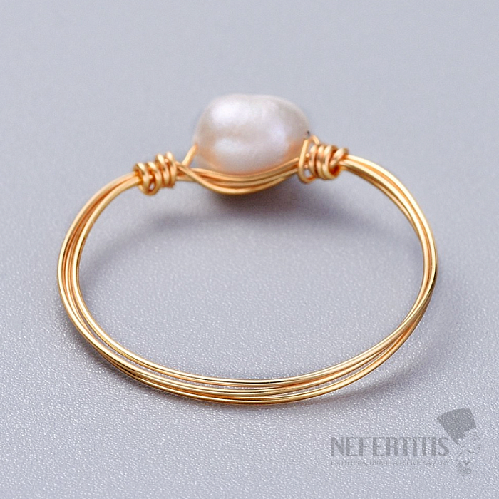 Prstýnek s kultivovanou sladkovodní perlou. Perla je cca 7 - 8 mm velká, materiál: měděný drátek ve zlaté úpravě. Ilustrativní vyobrazení přídního materiálu.