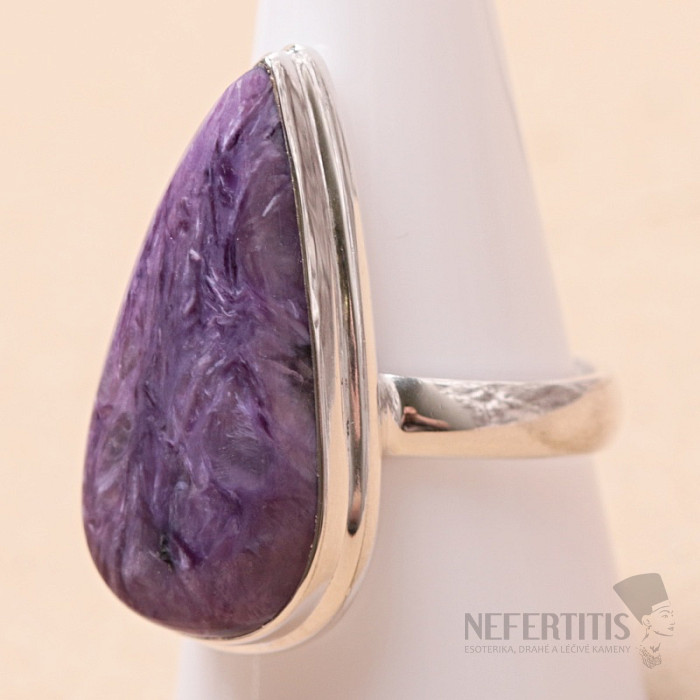 Stříbrný prsten s čaroitem. Nádherně fialově zbarvený čaroit vás okouzlí nejen svým hedvábným leskem, ale i proměnou kresby v měnícím se světle. Ag 925. Velikost kamene cca 2,8 cm. Kupujete přímo vyobrazený šperk.