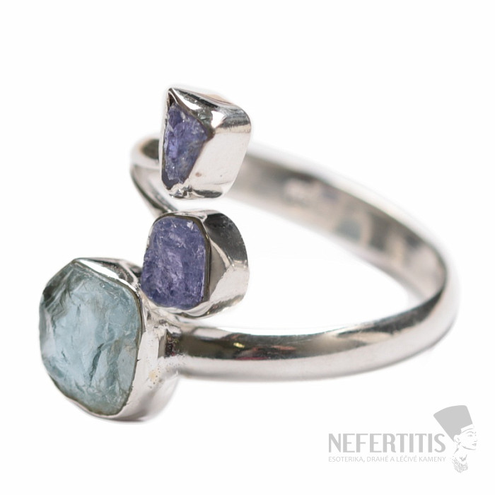 Stříbrný designový prsten se surovým akvamarínem a tanzanity. Ag 925. Tento prsten je obzvláště krásný nejen svým tvarem, ale především svým zpracováním. Velikost části s kameny cca 2,2 cm. Kupujete přímo vyobrazený šperk.