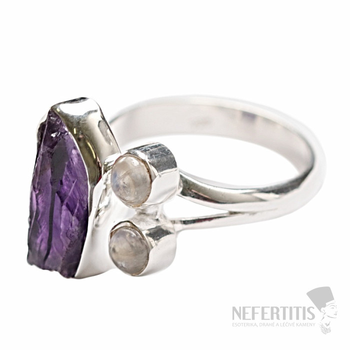 Stříbrný designový prsten s surovým ametystem a měsíčními kameny. Ag 925. Tento prsten je obzvláště krásný nejen svým tvarem, ale především svým zpracováním. Velikost ametystu cca 2,2 cm. Kupujete přímo vyobrazený šperk.