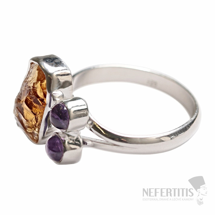Stříbrný designový prsten se surovým citrínem a ametysty. Ag 925. Tento prsten je obzvláště krásný nejen svým tvarem, ale především svým zpracováním. Velikost citrínu cca 1,3 cm. Kupujete přímo vyobrazený šperk.