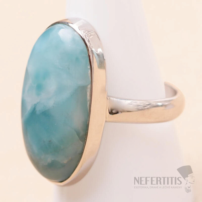Elegatní prsten stříbro s krásným a velmi kvalitním kabošonem larimaru, jenž připomíná hru slunečních paprsků na hladině moře. Kámen larimaru je pečlivě vybrán se zřetelně modrým vybarvením a kresbou. Velikost larimaru cca 2,7 cm. Ag 925. Kupujete přímo vyobrazený šperk.