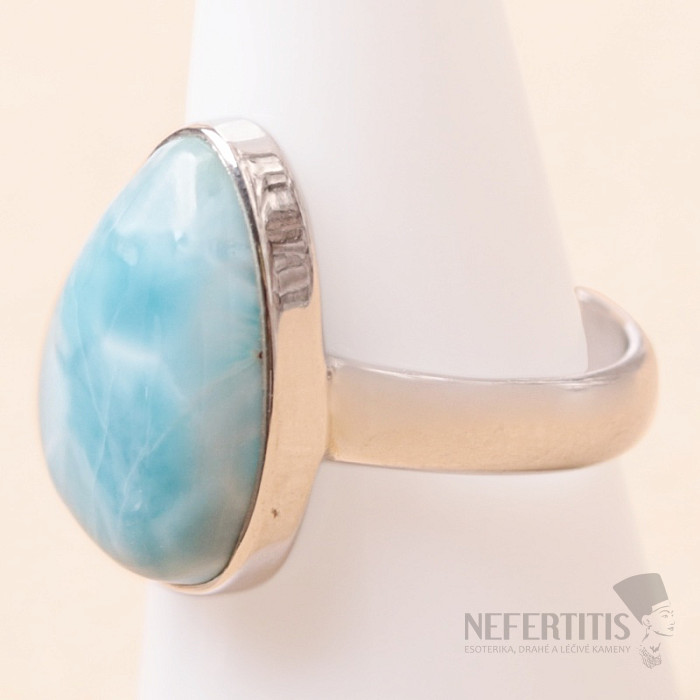 Elegatní prsten stříbro s krásným a velmi kvalitním kabošonem larimaru, jenž připomíná hru slunečních paprsků na hladině moře. Kámen larimaru je pečlivě vybrán se zřetelně modrým vybarvením a kresbou. Velikost larimaru cca 1,7 cm. Ag 925. Kupujete přímo vyobrazený šperk.