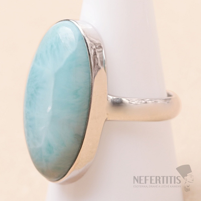 Elegatní prsten stříbro s krásným a velmi kvalitním kabošonem larimaru, jenž připomíná hru slunečních paprsků na hladině moře. Kámen larimaru je pečlivě vybrán se zřetelně modrým vybarvením a kresbou. Velikost larimaru cca 2,7 cm. Ag 925. Kupujete přímo vyobrazený šperk.
