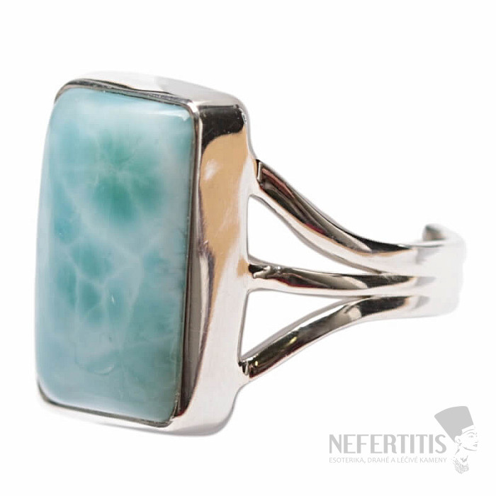 Elegatní prsten stříbro s krásným a velmi kvalitním kabošonem larimaru, jenž připomíná hru slunečních paprsků na hladině moře. Kámen larimaru je pečlivě vybrán se zřetelně modrým vybarvením a kresbou. Velikost larimaru cca 1,8 cm. Ag 925. Kupujete přímo vyobrazený šperk.