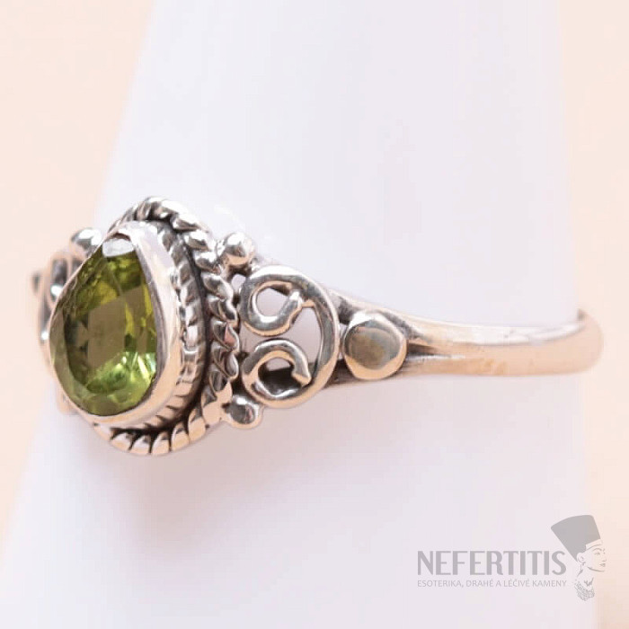 Stříbrný prsten s broušeným olivínem. Ag 925. Díky broušeným ploškám vynikne krásná barva olivínu, zvýrazněná třpytem při dopadajícím světle. Kupujete přímo vyobrazený šperk. Velikost kamene cca 0,7 cm.