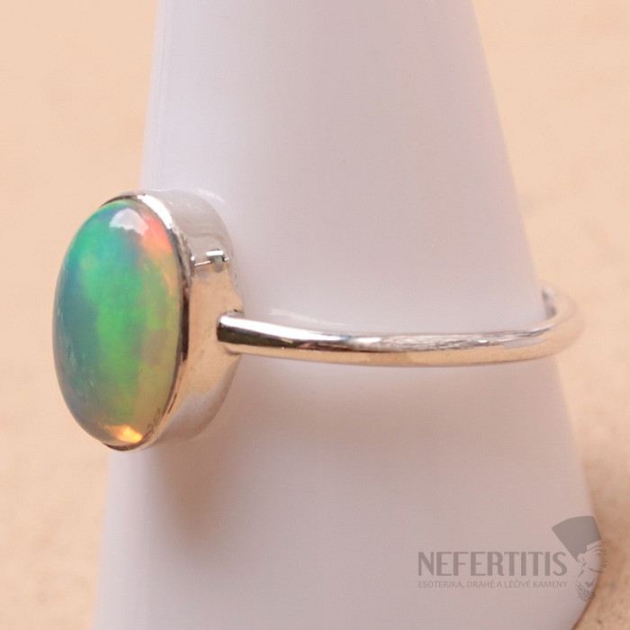 Elegantní stříbrný prsten s kabošonem etiopského opálu. Ag 925. Působivý a elegantní šperk, od pohledu navozující radost a pocity harmonie. Etiopské opály oproti australským opálům doslova hýří až neonově zářivými odlesky barev. Ačkoliv na první pohled na to nevypadají, ohňostroj barev, který z opálu v tomto přívěsku vytryskne při každém dopadu světla, okouzlí nejen vás, ale celé vaše okolí. Velikost kamene cca 1,1 cm. Kupujete přímo vyobrazený šperk.