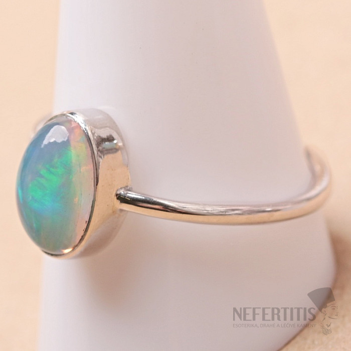 Elegantní stříbrný prsten s kabošonem etiopského opálu. Ag 925. Působivý a elegantní šperk, od pohledu navozující radost a pocity harmonie. Etiopské opály oproti australským opálům doslova hýří až neonově zářivými odlesky barev. Ačkoliv na první pohled na to nevypadají, ohňostroj barev, který z opálu v tomto přívěsku vytryskne při každém dopadu světla, okouzlí nejen vás, ale celé vaše okolí. Velikost kamene cca 1,1 cm. Kupujete přímo vyobrazený šperk.