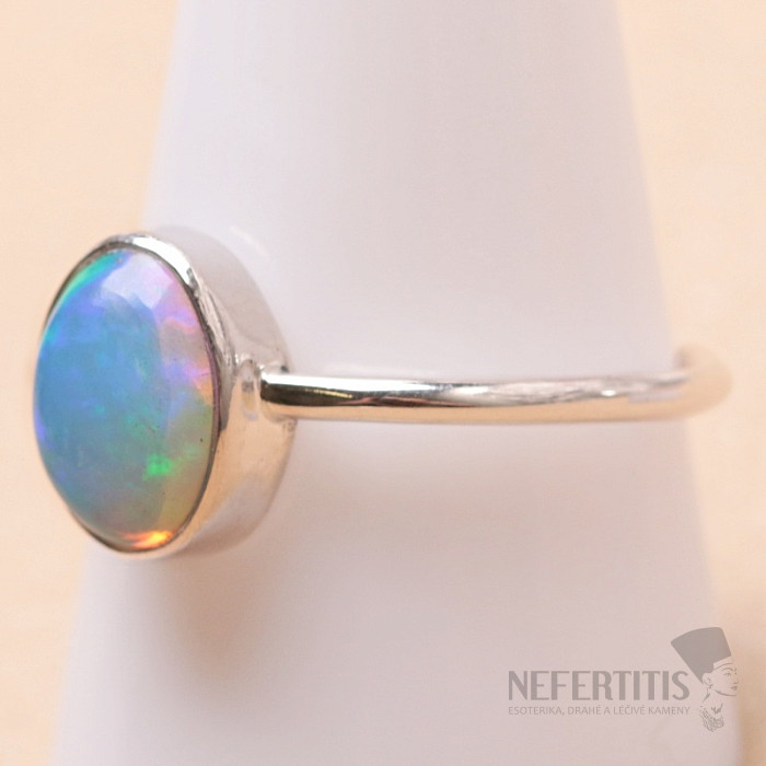 Elegantní stříbrný prsten s kabošonem etiopského opálu. Ag 925. Působivý a elegantní šperk, od pohledu navozující radost a pocity harmonie. Etiopské opály oproti australským opálům doslova hýří až neonově zářivými odlesky barev. Ačkoliv na první pohled na to nevypadají, ohňostroj barev, který z opálu v tomto přívěsku vytryskne při každém dopadu světla, okouzlí nejen vás, ale celé vaše okolí. Velikost kamene cca 1,1 cm. Kupujete přímo vyobrazený šperk.