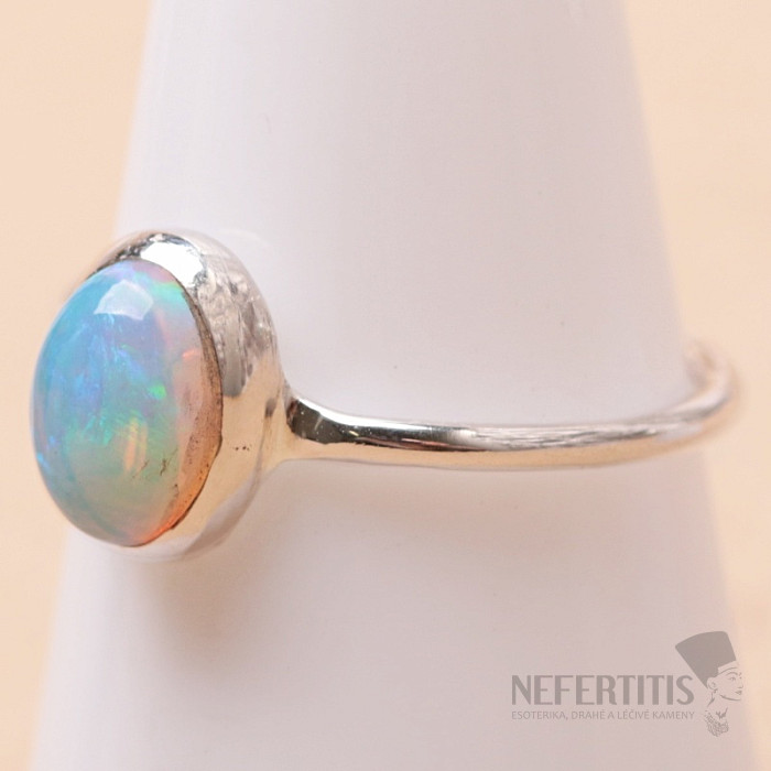 Elegantní stříbrný prsten s kabošonem etiopského opálu. Ag 925. Působivý a elegantní šperk, od pohledu navozující radost a pocity harmonie. Etiopské opály oproti australským opálům doslova hýří až neonově zářivými odlesky barev. Ačkoliv na první pohled na to nevypadají, ohňostroj barev, který z opálu v tomto přívěsku vytryskne při každém dopadu světla, okouzlí nejen vás, ale celé vaše okolí. Velikost kamene cca 0,9 cm. Kupujete přímo vyobrazený šperk.