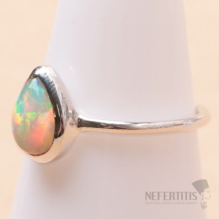 Elegantní stříbrný prsten s kabošonem etiopského opálu. Ag 925. Působivý a elegantní šperk, od pohledu navozující radost a pocity harmonie. Etiopské opály oproti australským opálům doslova hýří až neonově zářivými odlesky barev. Ačkoliv na první pohled na to nevypadají, ohňostroj barev, který z opálu v tomto přívěsku vytryskne při každém dopadu světla, okouzlí nejen vás, ale celé vaše okolí. Velikost kamene cca 0,9 cm. Kupujete přímo vyobrazený šperk.