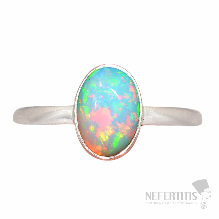Elegantní stříbrný prsten s kabošonem etiopského opálu. Ag 925. Působivý a elegantní šperk, od pohledu navozující radost a pocity harmonie. Etiopské opály oproti australským opálům doslova hýří až neonově zářivými odlesky barev. Ačkoliv na první pohled na to nevypadají, ohňostroj barev, který z opálu v tomto přívěsku vytryskne při každém dopadu světla, okouzlí nejen vás, ale celé vaše okolí. Velikost kamene cca 0,9 cm. Kupujete přímo vyobrazený šperk.