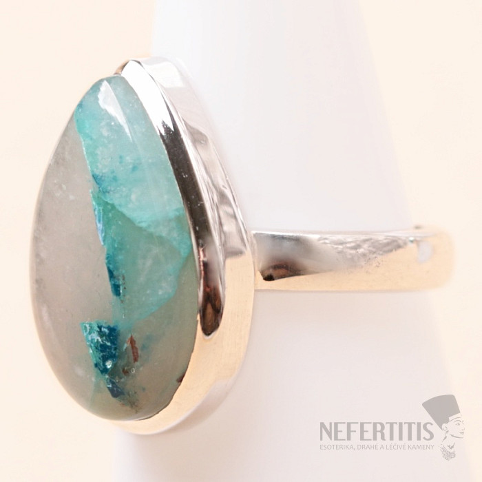 Půvabný stříbrný prsten se vzácným a sběratelsky ceněným přírodním Quantum quattro. Ag 925. Quantum quattro je kombinací čtyř minerálů - shattuckitu, dioptasu, malachitu a chryzokolu. Každý šperk je originální, neopakovatelný a díky barevné kombinaci a uspořádání minerálů podněcuje fantazii, připomíná pohled na Zemi z ptačí perspektivy. Budete mít krásný šperk, který nikdo nepřehlédne, vhodný pro různé příležitosti. Kupujete přímo vyobrazený šperk. Velikost kamene cca 1,9 cm.