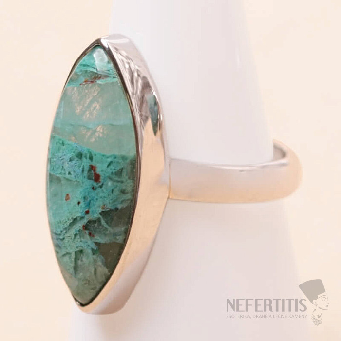 Půvabný stříbrný prsten se vzácným a sběratelsky ceněným přírodním Quantum quattro. Ag 925. Quantum quattro je kombinací čtyř minerálů - shattuckitu, dioptasu, malachitu a chryzokolu. Každý šperk je originální, neopakovatelný a díky barevné kombinaci a uspořádání minerálů podněcuje fantazii, připomíná pohled na Zemi z ptačí perspektivy. Budete mít krásný šperk, který nikdo nepřehlédne, vhodný pro různé příležitosti. Kupujete přímo vyobrazený šperk. Velikost kamene cca 2,3 cm.