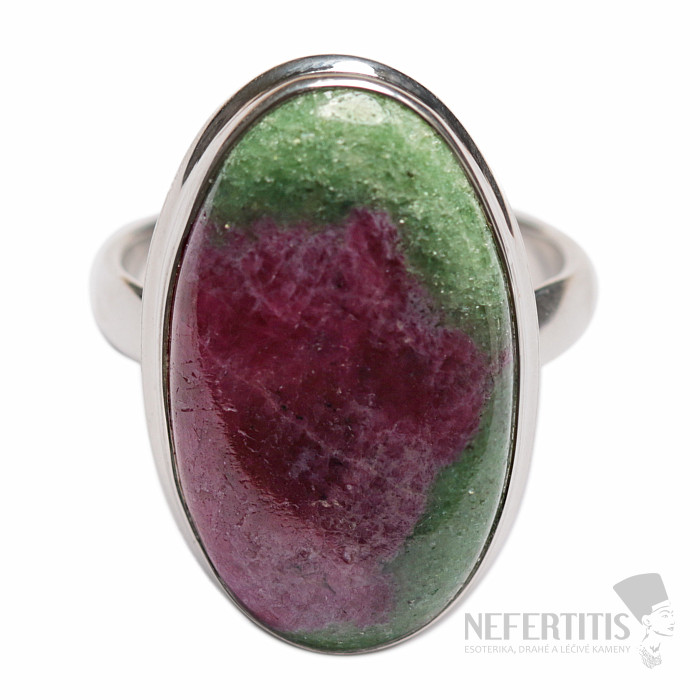 Krásný prsten s rubínem v zoisitu ve stříbře. Mimořádně hezký kámen, jaký máme v nabídce jen zřídka kdy, se vyznačuje sytými barvami šarlatového rubínu a několika tóny zelené barvy zositu. Nejen díky barvám, ale i nádherné kresbě kamene je tento prsten unikátní a nepřehlédnutelný. Velikost kamene cca 2,5 cm. Ag 925. Kupujete přímo vyobrazený šperk.
