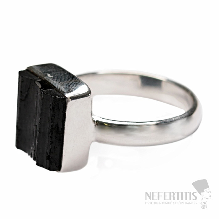 Atraktivní, elegantní, až trochu tajemný prsten z velkého surového černého turmalínu skorylu ve stříbře. Černá barva turmalínu, která krásně kontrastuje s leskem stříbrného rámečku, dává tomuto prstenu eleganci a činí z něj velmi dekorativní šperk. Černé surové turmalíny běžně obsahují prasklinky, je to jejich charakteristický rys a důkaz, že kupujete pravý přírodní tumalín. Ag 925. Velikost kamene cca 1,3 cm. Kupujete přímo vyobrazený šperk.