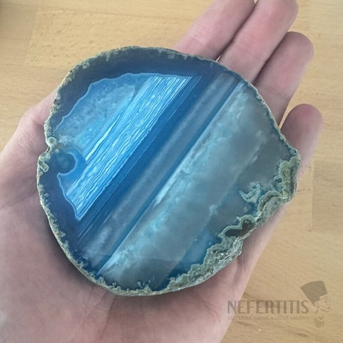 Atraktivní leštěný plátek achátu. Dekorativní prvek, který vzniká rozříznutím a leštěním přírodního achátu. Tento achátový plátek je dobarvovaný. Kupujete přímo vyobrazený kus.