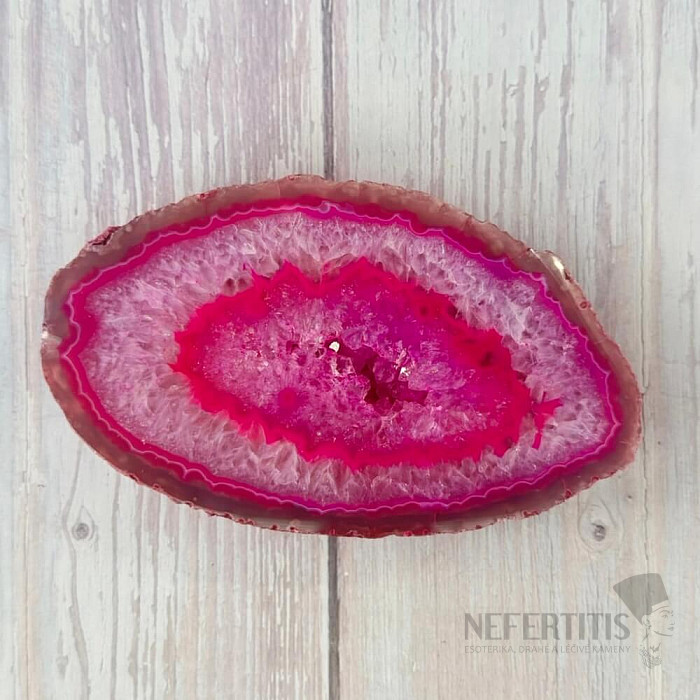 Atraktivní leštěný plátek achátu. Dekorativní prvek, který vzniká rozříznutím a leštěním přírodního achátu. Tento achátový plátek je dobarvovaný. Kupujete přímo vyobrazený kus.